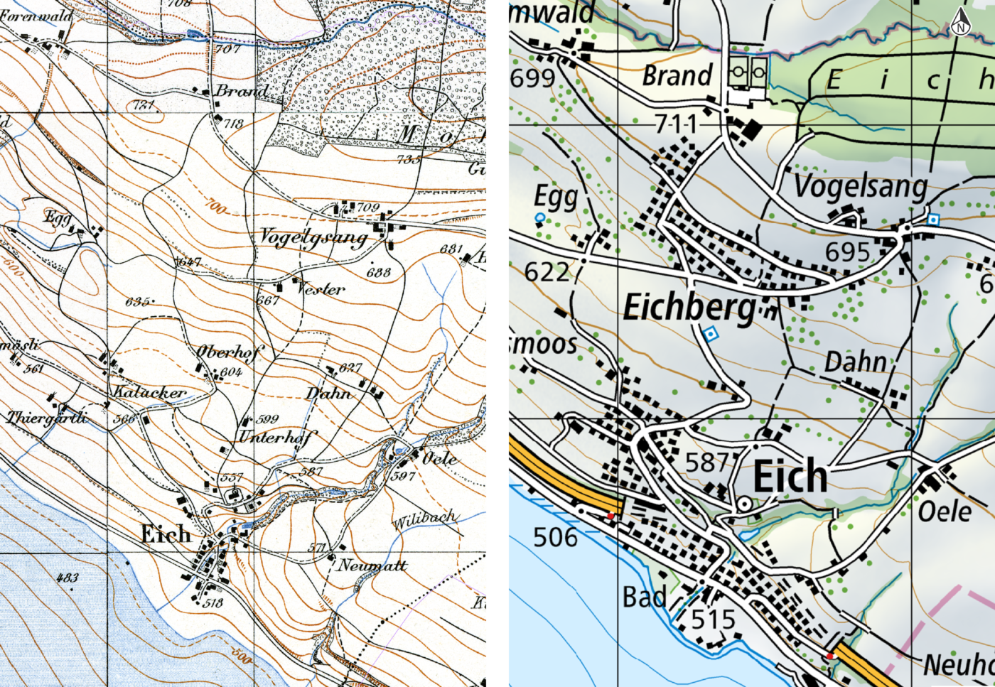 Früher war Eich ein kleines Dorf. Der erhoffte Aufschwung durch die Eisenbahn blieb aus, da die Linie auf der anderen Seeseite geführt wurde. Hier zwei identische Kartenausschnitte mit 100 Jahren Unterschied.