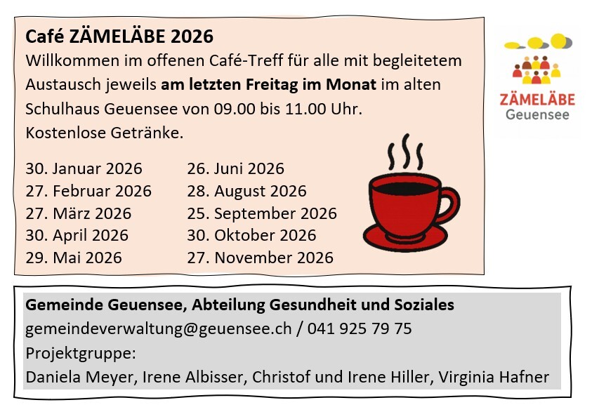 Am 30. Januar öffnet in Geuensee erstmals das Café ZÄMELÄBE seine Türen. Mit diesem neuen Begegnungscafé entsteht ein Ort, an dem Menschen zusammenkommen, ins Gespräch kommen und sich wohlfühlen können. Ein Treffpunkt für Jung und Alt, der Gemeinschaft und Miteinander fördert. Die engagierte Projektgruppe hat in den vergangenen Wochen mit viel Herzblut gearbeitet. Sie hat Sachspenden gesammelt, Möbel organisiert und den Raum mit liebevollen Details zu einem gemütlichen Treffpunkt gestaltet. Durch diesen Einsatz ist ein Ort entstanden, an dem man sich auf Anhieb willkommen fühlt. Das Café ist künftig immer am letzten Freitag im Monat von 9.00 - 11.00 Uhr geöffnet. Bereits jetzt haben sich mehrere Freiwillige gemeldet, die das Team unterstützen und beim Betrieb des Cafés mithelfen möchten. Dieser Zusammenhalt zeigt, wie gross das Bedürfnis nach einem offenen Begegnungsort in der Gemeinde ist.